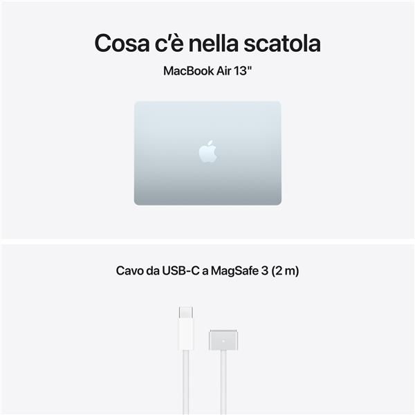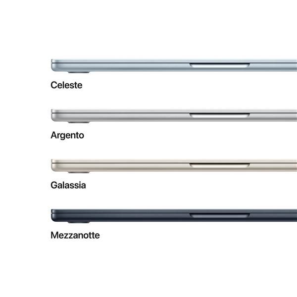 Fa tutto. E subito. Il chip M5 rende ogni operazione più fluida e veloce: te ne accorgi quando lavori con più app e pannelli aperti in contemporanea, quando monti video 4K o quando ti immergi in giochi come InZOI. E il design senza ventola rende tutto supersilenzioso.Progettato per l’AI. A partire dal chip.Per chi studia, gestisce un’attività o svolge professioni creative: MacBook Air con M5 è progettato per sfruttare al meglio l’AI nei flussi di lavoro quotidiani, sempre nel rispetto assoluto della tua privacy. Dalle potenti funzioni di Apple Intelligence in macOS e nelle app ai modelli linguistici di grandi dimensioni fino al vibe coding, tutto quel che fai è più efficiente e protetto che mai.Apple Intelligence. Fai tutto, come niente.Apple Intelligence è il sistema di intelligenza personale che rende più facile scrivere, creare e fare tutto ciò che vuoi. E grazie a funzioni di ultima generazione per la tutela della privacy, hai la certezza che nessuno potrà accedere ai tuoi dati, nemmeno Apple.macOS Un orizzonte di possibilità.macOS è progettato per adattarsi al tuo modo di lavorare, creare e comunicare, con app potenti e multitasking fluido.Nati per stare insieme.Mac e iPhone sono già straordinari da soli, ma insieme fanno faville. Grazie a Continuity, puoi passare da un dispositivo all’altro in un attimo per condividere file e foto o continuare il lavoro che stai facendo.Un vero spettacolo.Il display Liquid Retina di MacBook Air supporta un miliardo di colori e ha una risoluzione incredibile. Foto e video sembrano saltar fuori dallo schermo grazie all’elevato contrasto e alla nitidezza dei dettagli. E anche il testo è ultradefinito.Un tipo con molte connessioni.Il cavo di ricarica MagSafe si aggancia e si sgancia magneticamente in un attimo, così il tuo MacBook Air non rischia di venire trascinato a terra. Le due porte Thunderbolt 4 permettono di collegare dispositivi ad alta velocità e di ricaricare il tuo Mac. Il comodo jack per le cuffie funziona anche con i modelli ad alta impedenza. E il chip wireless Apple N1 supporta le tecnologie Wi-Fi 7 e Bluetooth 6, migliorando prestazioni e affidabilità.Un tocco di tranquillità.Il Touch ID sulla Magic Keyboard è il modo più semplice, veloce e sicuro per sbloccare il Mac, accedere agli account e autorizzare i pagamenti. E in più hai tecnologie di crittografia all’avanguardia, una solida protezione contro i virus e aggiornamenti di sicurezza gratuiti e automatici per mantenere i tuoi dati al sicuro.