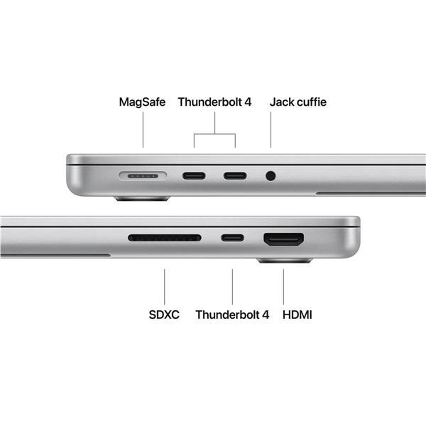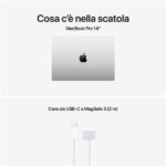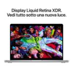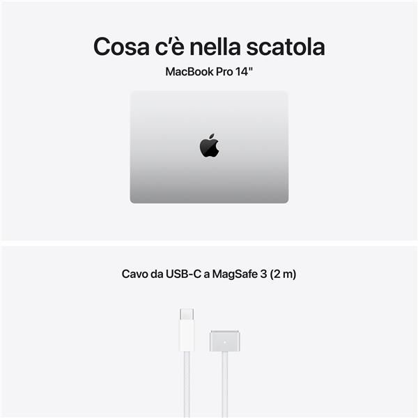 Apple MacBook Pro 14″ Chip M5 10-core CPU 10-core GPU, 24GB, 1TB SSD ArgentoMacBook Pro 14″. Con i superpoteri di M5.MacBook Pro 14″ con chip M5 ti offre una velocità eccezionale e una potente AI on device per lavorare, creare e fare tutto ciò che ami. Ha fino a 24 ore di autonomia e un display Liquid Retina XDR.Caratteristiche principali– CON I SUPERPOTERI DI M5 – Oltre a una CPU e una memoria più veloci, il chip M5 ha una GPU più potente con un Neural Accelerator in ogni core, per mettere il turbo quando si usa l’AI. Così puoi sfrecciare a velocità incredibili anche nei lavori più complessi.- PROGETTATO PER APPLE INTELLIGENCE – Apple Intelligence è il sistema di intelligenza personale che rende più facile scrivere, creare e fare tutto ciò che vuoi. E grazie a una protezione totale della privacy, hai la certezza che nessuno potrà accedere ai tuoi dati, nemmeno Apple.- FINO A 24 ORE DI BATTERIA – MacBook Pro 14″ ti dà performance incredibili costantemente, anche quando non è collegato alla corrente.- I CHIP APPLE METTONO IL TURBO ALLE APP – Tutti i tuoi programmi preferiti, da Microsoft 365 a Adobe Creative Cloud, vanno a tutta velocità su macOS.- SE AMI IL TUO IPHONE, AMERAI ANCHE IL MAC – Il Mac funziona in perfetta sintonia con gli altri dispositivi Apple. Puoi fare copia e incolla dall’iPhone al Mac. E anche usare il computer per inviare messaggi di testo o fare e ricevere chiamate FaceTime.- BRILLANTE DISPLAY PRO – Il display Liquid Retina XDR da 14,2″ ha 1600 nit di luminosità di picco, fino a 1000 nit di luminosità costante e un contrasto di 1.000.000:1.- VIDEOCAMERA E AUDIO EVOLUTI – La videocamera Center Stage da 12MP ti tiene sempre al centro della scena, mentre i tre microfoni di livello professionale e i sei altoparlanti con audio spaziale e supporto per Dolby Atmos garantiscono un sonoro ottimale.- SI CONNETTE A TUTTO – Questo MacBook Pro ha tre porte Thunderbolt 4 e una porta MagSafe 3 per la ricarica, uno slot SDXC card, una porta HDMI e un jack per le cuffie. E ti permette di collegare fino a due monitor esterni.- PRIVACY E SICUREZZA SONO DI SERIE – Ogni Mac è dotato di robuste protezioni contro virus e malware. Se perdi il tuo Mac o ti viene rubato, l’app Dov’è può aiutarti a ritrovarlo. FileVault si assicura che i tuoi file siano protetti dalla crittografia, così solo tu puoi accedere. E gli aggiornamenti di sicurezza gratuiti contribuiscono a proteggerlo ancora di più.Sono forti e vanno forte.M5 si aggiunge a M4 Pro e M4 Max formando una squadra straordinaria: sono i tre chip più evoluti mai progettati per un portatile professionale. Con le fenomenali prestazioni della CPU single-thread e multi-thread e una memoria unificata più rapida, questi chip ti danno una velocità che sfiora l’impossibile. E grazie ai potenti Neural Accelerator di M5, sfrecci anche nelle attività che usano l’intelligenza artificiale.Fino a 6 volte più veloce con l’AI rispetto a M1Nel chip M5 ogni core della GPU ha un Neural Accelerator, per mettere il turbo all’intelligenza artificiale, per esempio durante la generazione di immagini con modelli di diffusione o nell’elaborazione dei prompt dei modelli linguistici di grandi dimensioni (LLM). E grazie al Neural Engine 16-core, base portante di Apple Intelligence, l’AI on-device è più potente e consuma meno batteria.M5Con M5, chi studia, lavora o ha voglia di creare può contare su una velocità eccezionale e su potenti funzioni AI on-device.Mac fa volare le app con AI.Ottimizzato per gestire app all’avanguardia nell’uso dell’intelligenza artificiale, Mac spinge al massimo programmi come DiffusionBee per la generazione di immagini, come Msty AI e LM Studio per i modelli LLM, e come Topaz Video per l’ottimizzazione video.Strumenti di AI nelle app: la magia è su Mac.Trasforma le registrazioni vocali grazie a plug-in basati sull’AI come MicDrop per Logic Pro. E ritocca le immagini apportando in pochi secondi modifiche complesse con il Riempimento generativo di Adobe Photoshop.Apple Intelligence, al tuo servizio.Con Apple Intelligence scrivere, creare e fare tutto ciò che vuoi diventa più facile. Trasforma una nota preparata al volo in un annuncio impeccabile. Elimina gli elementi di distrazione dalle foto con lo strumento Ripulisci. Crea immagini sfruttando i nuovi stili di ChatGPT su Image Playground. E usa le azioni intelligenti nell’app Comandi Rapidi per costruirti le automazioni che preferisci: per esempio confrontare la trascrizione di un audio con gli appunti che hai preso ed estrarre informazioni da un PDF. Apple Intelligence è l’intelligenza artificiale pensata apposta per te.Batteria. Un giorno intero di autonomia. Molla la presa.MacBook Pro ha l’autonomia migliore di sempre su un Mac: fino a 24 ore. E con la ricarica rapida arrivi al 50% della carica in soli 30 minuti. Tutti i modelli mantengono lo stesso livello di prestazioni anche quando non sono collegati alla corrente, così puoi concentrarti sulle tue attività senza perdere tempo a cercare una presa.macOS Tahoe. Ha un’altra faccia, ma il carattere rimane Mac.Il design con Liquid Glass dà a macOS Tahoe un look rinnovato, ma l’esperienza è la stessa che ami e conosci già. Grazie ai nuovi modi per lavorare meglio, interagire all’istante con iPhone e sfruttare al massimo Apple Intelligence, questa è la versione di macOS più potente e bella di sempre.Liquid Glass, il look da fare tuo.Con il nuovo design, il display sembra ancora più ampio e hai più possibilità di personalizzazione. Scegli tra icone chiare e scure, o prova l’elegante look trasparente.Spotlight passa subito all’azione.Con Spotlight puoi fare di tutto senza dover alzare un dito dalla tastiera: inviare un messaggio, eliminare una nota e tanto altro.“Traduzione in tempo reale” parla la tua linguaUsa questa funzione per tradurre automaticamente i testi nell’app Messaggi.Comandi rapidi. Come per magia.Velocizza