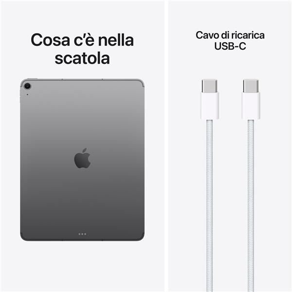 Apple iPad Air 13” Wi-Fi + Cellular 256GB – Grigio SideraleiPad Air. Progettati per Apple Intelligence.iPad Air 13″. Progettato per Apple Intelligence.iPad Air, ora con i superpoteri di M4. Incredibile, nelle prestazioni e nel prezzo. Ha uno splendido display Liquid Retina, una videocamera frontale Center Stage da 12MP per videochiamate perfette, iPadOS, Wi Fi 7 e 5G ultrarapidi. Inoltre puoi usarlo con Apple Pencil Pro, con la Magic Keyboard per iPad Air e con altri accessori, per lavorare, studiare, giocare e creare facilmente, anche in multitasking.Caratteristiche principali – PERCHÉ IPAD AIR – iPad Air con chip Apple M4 ti offre prestazioni ancora più scattanti e uno splendido design in due taglie superportatili. Ha le potenti funzioni di Apple Intelligence, uno spettacolare display Liquid Retina, Touch ID, fotocamere evolute e Wi Fi 7.- PERFORMANCE E SPAZIO DI ARCHIVIAZIONE – Il chip M4 ti dà una grafica evoluta e prestazioni straordinarie, per poter usare più app simultaneamente e gestire le attività AI più complesse. E con un giorno intero di autonomia, puoi continuare a lavorare e divertirti ovunque vai. Scegli fino a 1TB di archiviazione per app, musica, film e altro.- IPADOS + APP – Con le funzioni rivoluzionarie e il design intuitivo di iPadOS, le tue app girano a meraviglia e la tua produttività decolla. Il sistema flessibile di gestione delle finestre ti permette di organizzare e tenere sotto controllo ogni attività come mai prima d’ora.- APPLE INTELLIGENCE – Apple Intelligence è il sistema di intelligenza personale che rende più facile creare, comunicare e fare tutto ciò che vuoi, con funzioni di ultima generazione per la tutela della privacy.- DISPLAY LIQUID RETINA DA 13″ – Lo splendido display Liquid Retina ha tecnologie evolute come il True Tone e l’ampia gamma cromatica P3, oltre a una riflettanza ridotta al minimo: per questo ti dà immagini assolutamente spettacolari.- CONNETTIVITÀ – Grazie al Wi Fi 7 con chip Apple N12 puoi trasferire in un attimo foto, documenti e video di grandi dimensioni. E con Apple C1X hai il velocissimo 5G per rimanere in contatto col mondo in ancora più posti.- APPLE PENCIL E MAGIC KEYBOARD PER IPAD AIR – Con Apple Pencil Pro e Apple Pencil (USB C) puoi disegnare, prendere appunti e creare in modo preciso e intuitivo. La Magic Keyboard è comodissima per scrivere e ha un trackpad con feedback aptico.- FOTOCAMERE EVOLUTE – iPad Air ha una videocamera frontale Center Stage da 12MP ideale per selfie e videochiamate. La fotocamera posteriore da 12MP con grandangolo invece è perfetta per fare scansioni di documenti, scattare foto e girare video 4K.- SBLOCCA E PAGA CON TOUCH ID – Con Touch ID ti basta un tocco per sbloccare l’iPad Air, accedere alle app e pagare i tuoi acquisti in totale sicurezza con Apple PayM4. La potenza va più suuuuu.Il velocissimo chip M4 ha il 50% di memoria unificata in più, così il tuo iPad Air sarà un fulmine in tutto. È un concentrato di potenza al servizio dell’intelligenza artificiale: le funzioni che usi ogni giorno ti aiuteranno a fare quello che vuoi in modo ancora più rapido ed efficiente. E l’architettura della GPU ti offre prestazioni grafiche fenomenali per lavorare, guardare video in streaming, creare o giocare. In più, ha una batteria che dura tutto il giorno: un’efficienza niente male, no?iPadOS e le app. Ora sì che si vola.Lo splendido design Liquid Glass dal look sorprendente è solo una delle tante incredibili innovazioni di iPadOS 26 che portano la produttività di iPad Air a un livello mai visto. Il sistema di gestione delle finestre è stato riprogettato per offrirti ancora più flessibilità ed efficienza. Puoi usare app professionali, lanciarti in giochi ad alte prestazioni e affrontare ogni progetto creativo con un’interfaccia immediata, pensata per i gesti touch.Apple Intelligence. Un aiuto sempre pronto per le cose di ogni giorno.iPad Air è progettato per Apple Intelligence, il sistema di intelligenza personale che rende più facile creare, comunicare e fare tutto ciò che vuoi. E grazie a funzioni di ultima generazione per la tutela della privacy, hai la certezza che nessuno potrà accedere ai tuoi dati, nemmeno Apple.